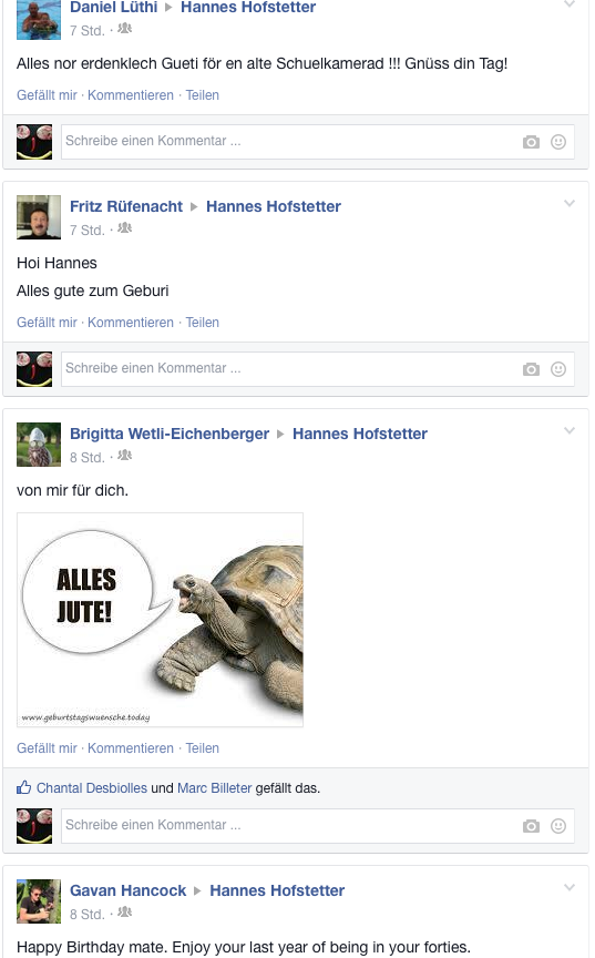 Was die Qualität der Wünsche betrifft, darf ich – auch mit Blick auf die mit 0815-„Alles Gute!“ und Allerwelts-„Happy Birthdays“ vollgestopften virtuellen Briefkästen von anderen Geburtstags“kindern“ – sagen: Potzpotz! Viele Gratulantinnen und Gratulanten liessen sich especially for me etwas einfallen, statt sich von der Website „Geburtstagswünsche für die Facebook-Pinwand“ inspieren zu lassen (doch, doch: diese Site gibts!). .